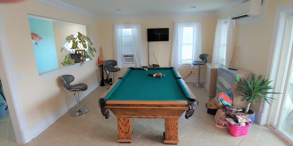 Step inside the first floor, and find a game room, kitchenette, as well as a full bath with shower. There is one bedroom downstairs with 1 queen and 2 twin beds. Perfect space for kids. Kitchenette equipped with a full size fridge and a microwave for your convenience.